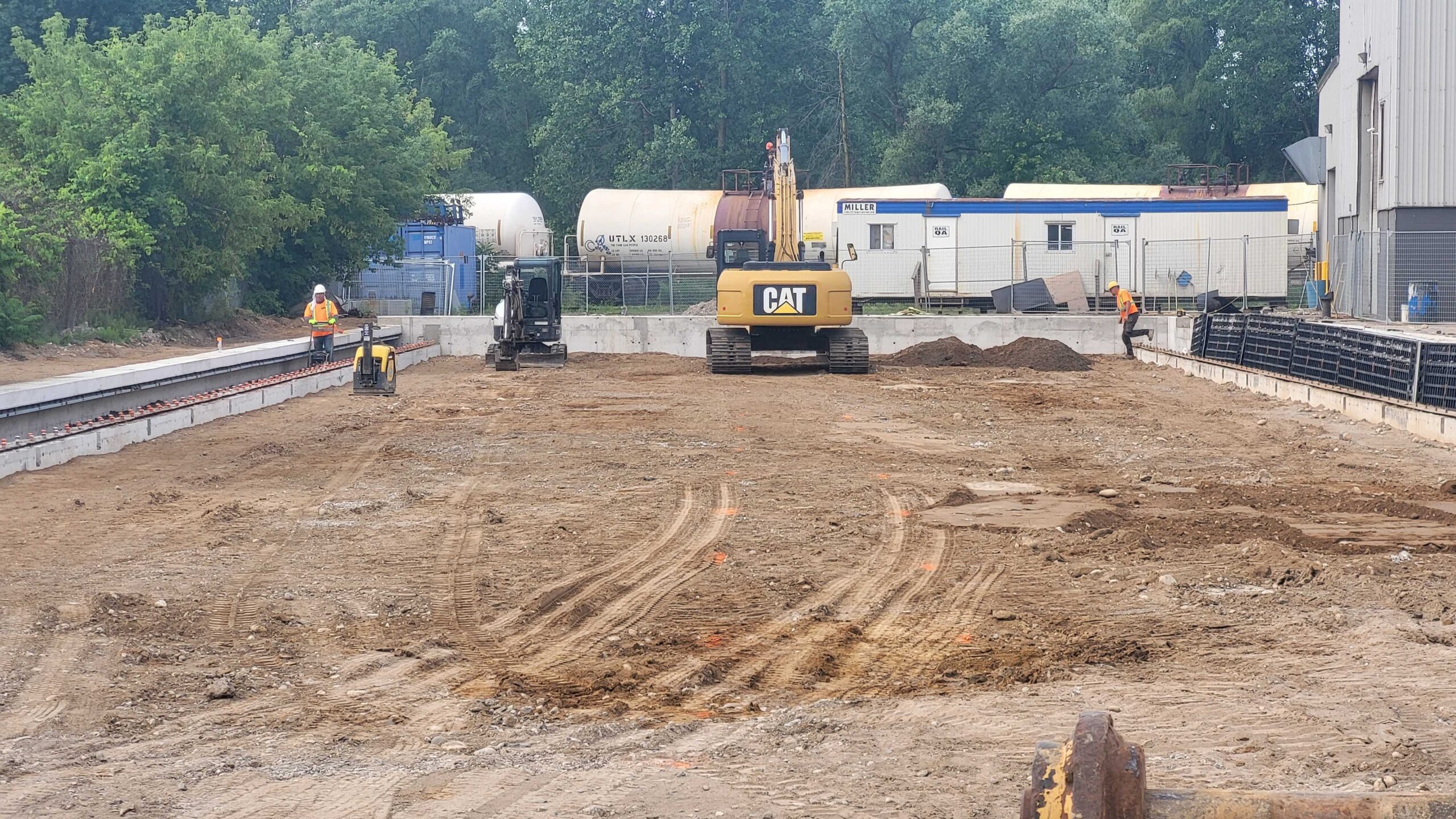 Asphalt removed; soil excavated, stockpiled, and backfilled; Granular A placed and compacted beneath rail foundations.